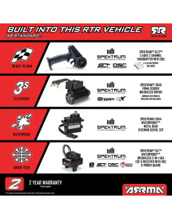 À l'intérieur se cache un système brushless Spektrum optimisé pour un maximum de plaisir. Le MINI KRATON démarre en trombe, encaisse les chocs et reste stable sur l'asphalte, la terre, le gravier et l'herbe. Son électronique étanche vous permet de profiter pleinement de votre pilotage, même dans les flaques et la boue. Chaque pression sur la gâchette vous rappelle que, malgré sa petite taille, ce KRATON n'a rien à envier aux autres. L'émetteur Spektrum SLT offre un contrôle optimal pour une prise en main facilitée. Limitez les gaz pour un apprentissage en douceur ou désactivez le limiteur une fois la PowerKey insérée et laissez le MINI KRATON exprimer tout son potentiel. Le système de contrôle dynamique de stabilité (DSC) Spektrum intégré propose 4 modes sélectionnables qui corrigent automatiquement la direction pour des figures acrobatiques faciles et maîtrisables, adaptées à vos préférences et à votre niveau.