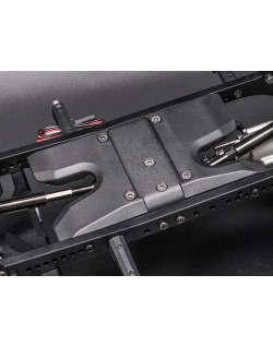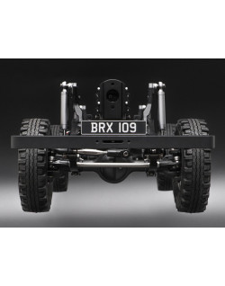 Ces modifications comprennent l'utilisation d'essieux BRX80 Scale PHAT™ légèrement plus étroits, une boîte de transfert B2X™ en aluminium anti-torsion identique à celle du BRX02 d'origine, mais compatible avec l'overdrive. Le châssis est doté de longerons en aluminium de 6 mm pour une robustesse, une rigidité et une maniabilité optimales. Une plaque de montage du variateur en acier inoxydable, située près du moteur avant, remplace la plaque en fibre de carbone à l'arrière du châssis BRX02 Leaf.