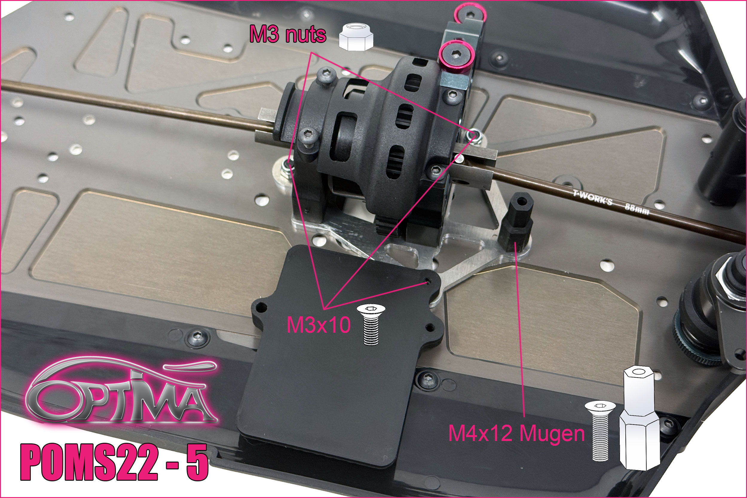 1 – Do screw the gabarit on the top of the chassis, by using the genuine MUGEN screws and holes.