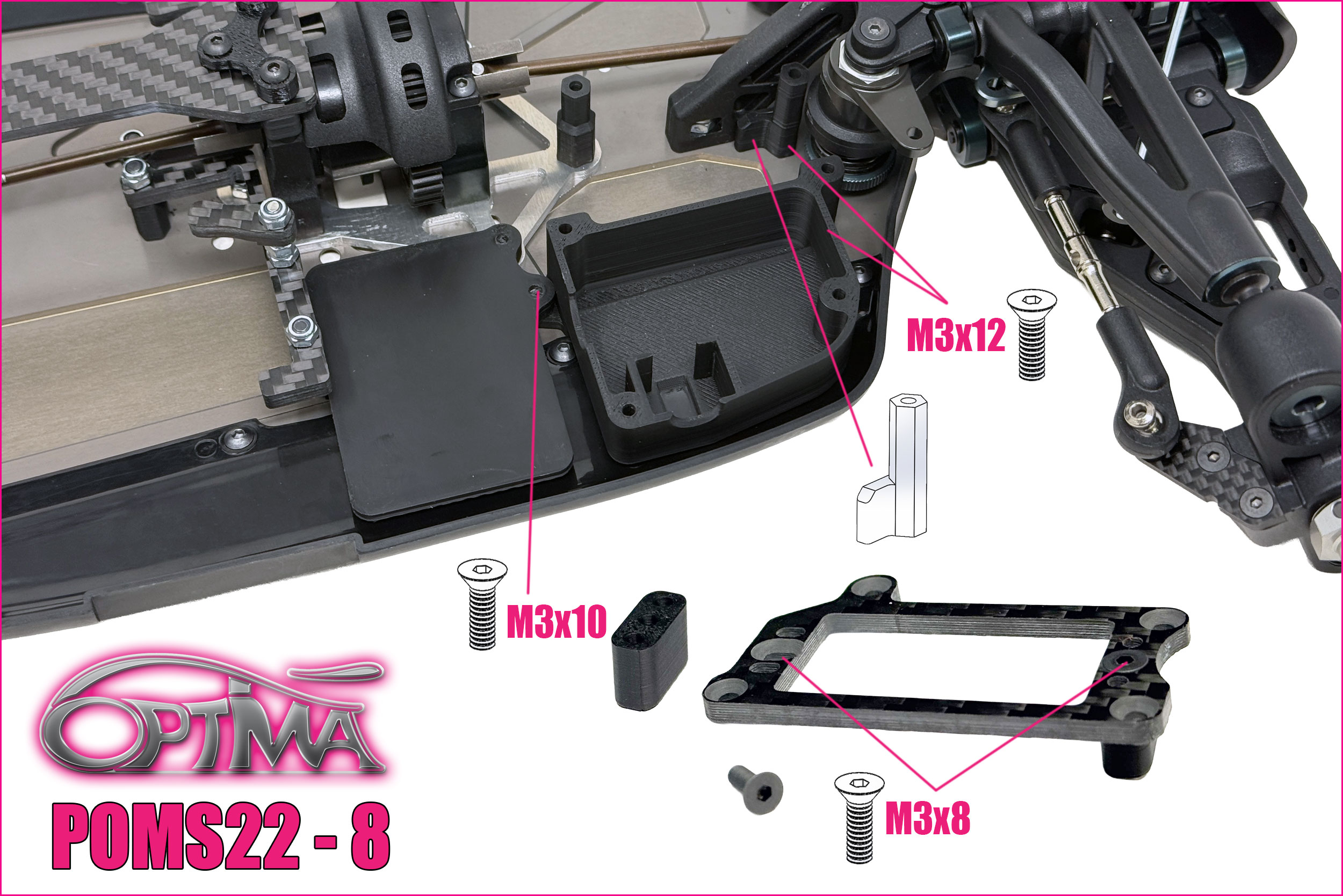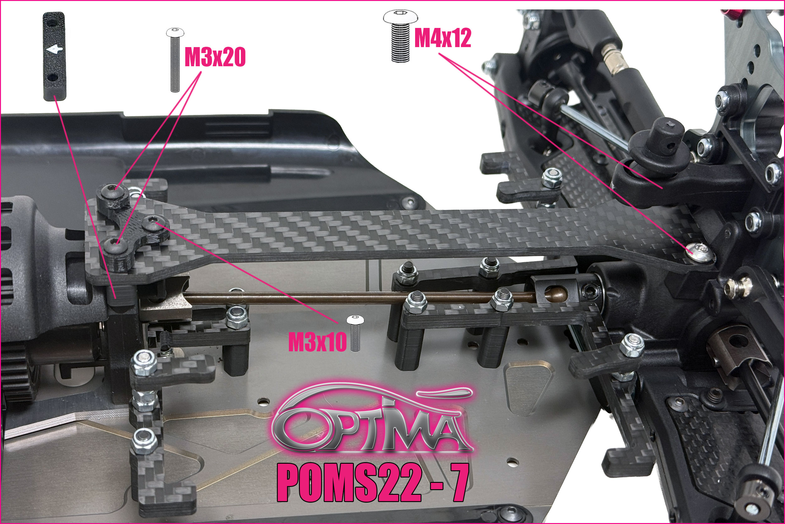7 – First, do attach the flexible guide (triangular shape) to the carbon fiber chassis brace with one M3x10mm screw and 1 nut, then mount the assembly onto the car. Note that the plastic adaptation part must be oriented in the proper way, ensure the arrow points towards the front of the car. Do not fully tighten the two M3x20mm screws on the bulkhead to allow flex.