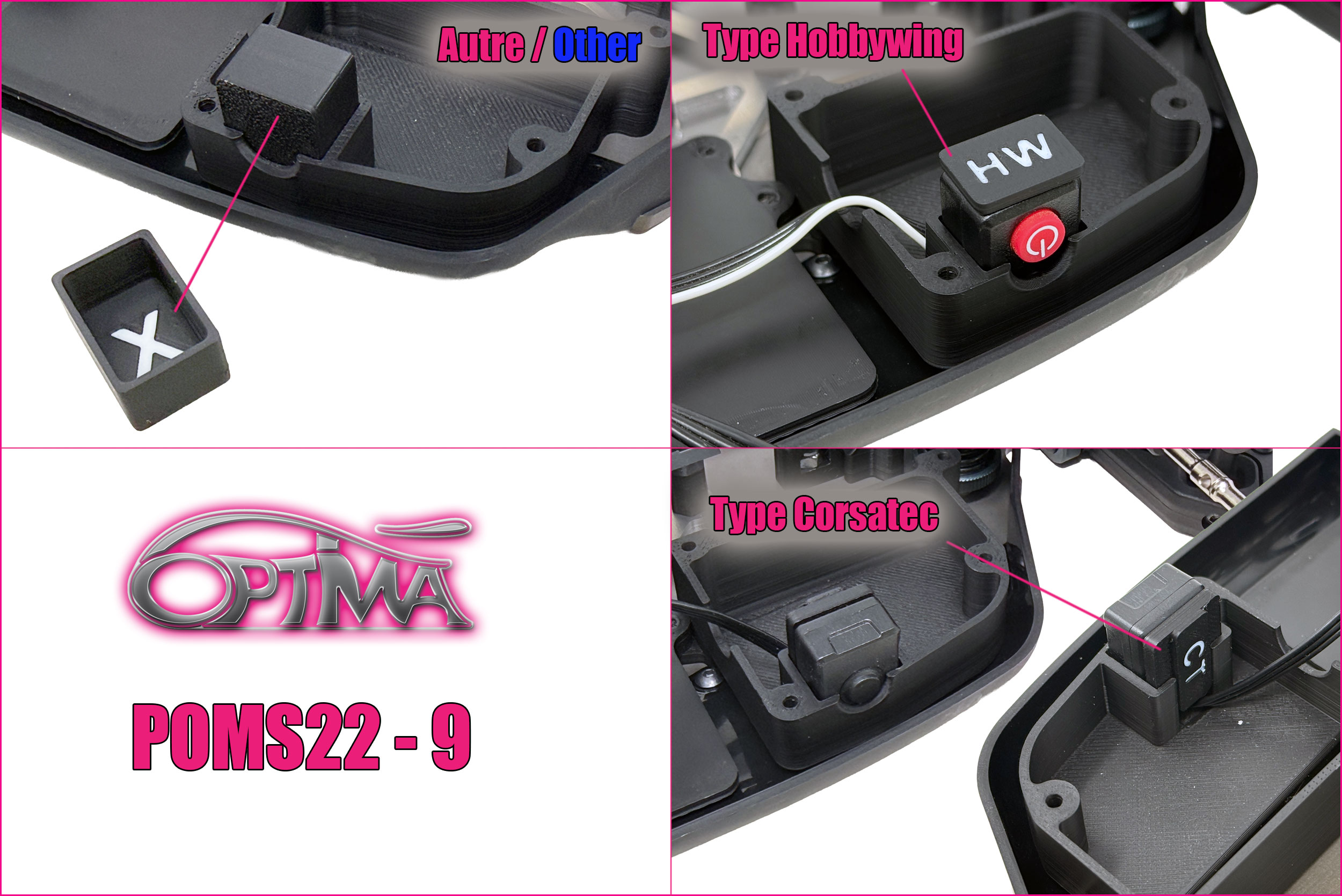 – Boitier de récepteur integrant la puce et les interrupteurs type Hobbywing ou Corsatec (un cache est aussi livré si vous utilisez un modèle different).