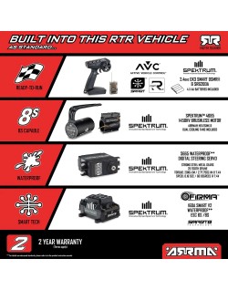 L'électronique Spektrum de haute qualité, installée en usine, est prête à l'emploi avec votre batterie LiPo 6S ou 8S (2x 3S ou 2x 4S). Le contrôleur Firma 160A Smart V2 avec connecteur IC5® est parfaitement adapté au moteur brushless Firma 1450Kv, équipé d'un dissipateur thermique ARRMA et de deux ventilateurs. Le puissant servo numérique Spektrum S665 à pignons métalliques, ainsi que le moteur et le contrôleur, sont étanches, vous permettant de piloter sans souci par tous les temps.