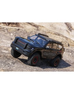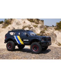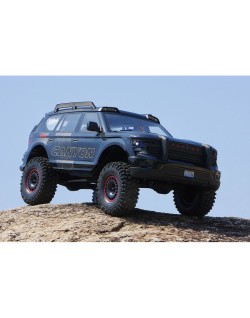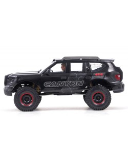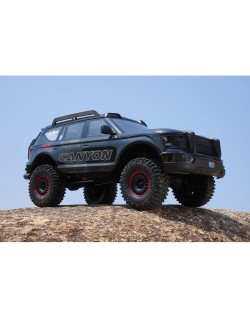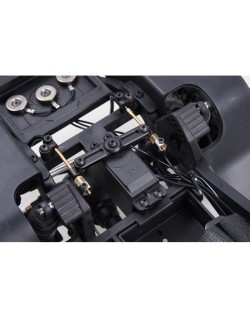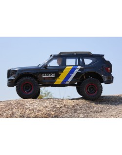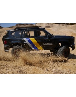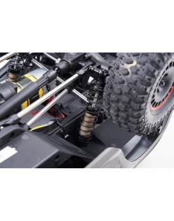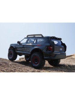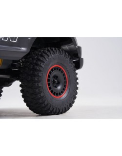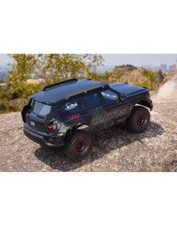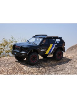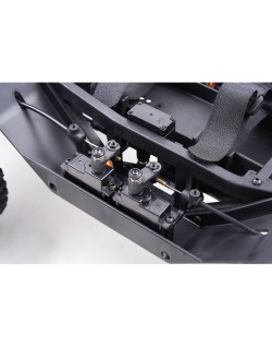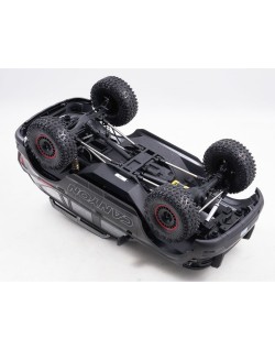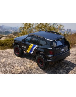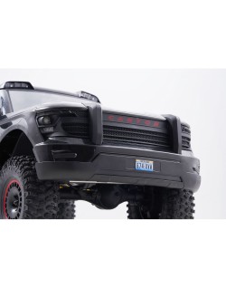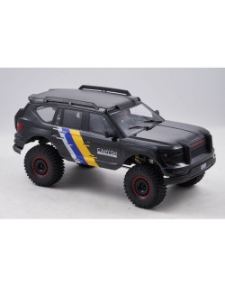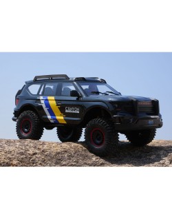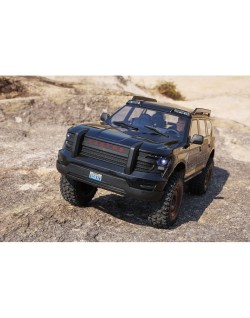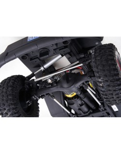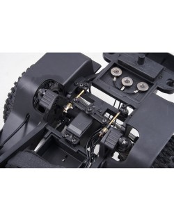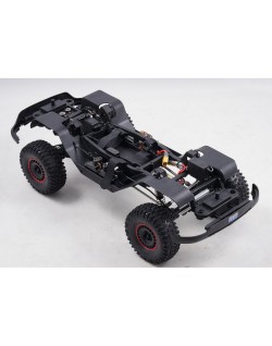 Le châssis est fabriqué à partir d'un matériau en nylon robuste et intègre une conception modulaire avec des assemblages à tenons et mortaises, garantissant une rigidité et une résistance globales adaptées aux besoins quotidiens en matière d'escalade. Le véhicule est équipé d'une transmission à deux vitesses à profil bas et d'une boîte de transfert avec marche arrière, ainsi que d'engrenages métalliques, de roulements à billes et d'essieux portiques avant et arrière, ce qui lui permet de simuler les caractéristiques de conduite de divers véhicules tout-terrain avec un centre de gravité ultra-bas. Afin de mieux protéger le servo de direction, un dispositif de protection du boîtier de direction est également inclus. Les deux côtés de l'essieu arrière sont équipés de pinces métalliques et de disques de frein, ce qui permet un virage de type char d'assaut où une roue est bloquée tandis que les trois autres tournent (DIG).