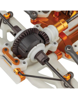 L'essieu avant est doté d'un différentiel à engrenages coniques, d'arbres de transmission universels et d'une voie réglable. Il comprend également des amortisseurs filetés à bain d'huile entièrement réglables, à l'avant comme à l'arrière.